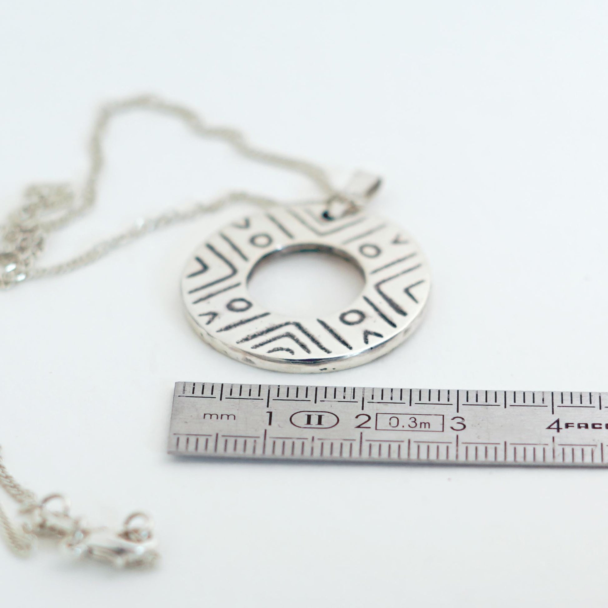 Sterling Silver donut shaped pendant with geometric pattern | Handmade circle necklace with ethnic design